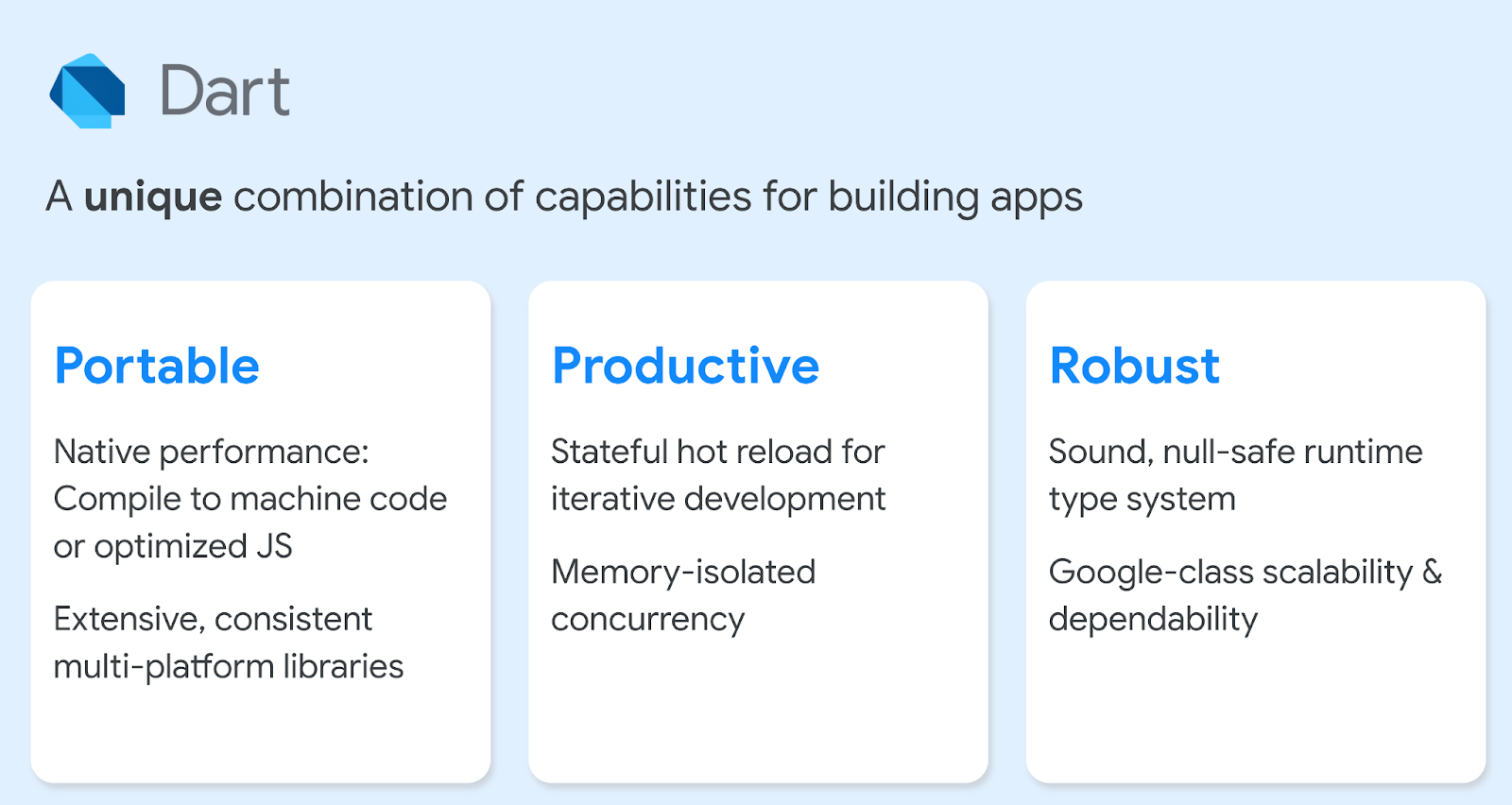 Robust: Dart’s sound, null-safe type system catches errors during development. And the overall platform is highly scalable and dependable, with production usage for more than a decade by a large range of apps, including business-critical apps such as Google Ads and Google Assistant.