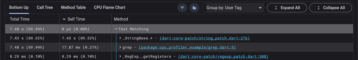 Now, let’s re-run our program and open up the CPU Profiler. To see our categorized profile, select the Group by: User Tag option from the dropdown: