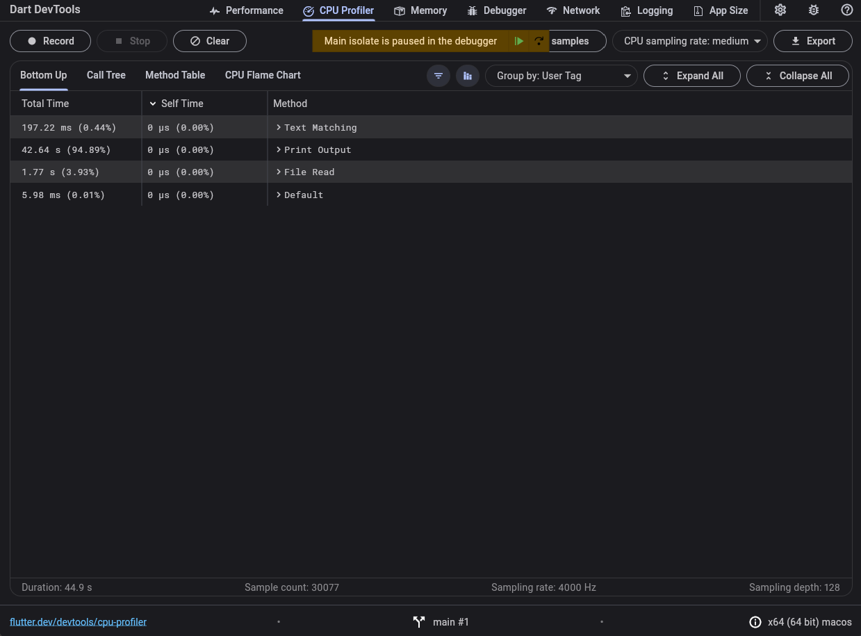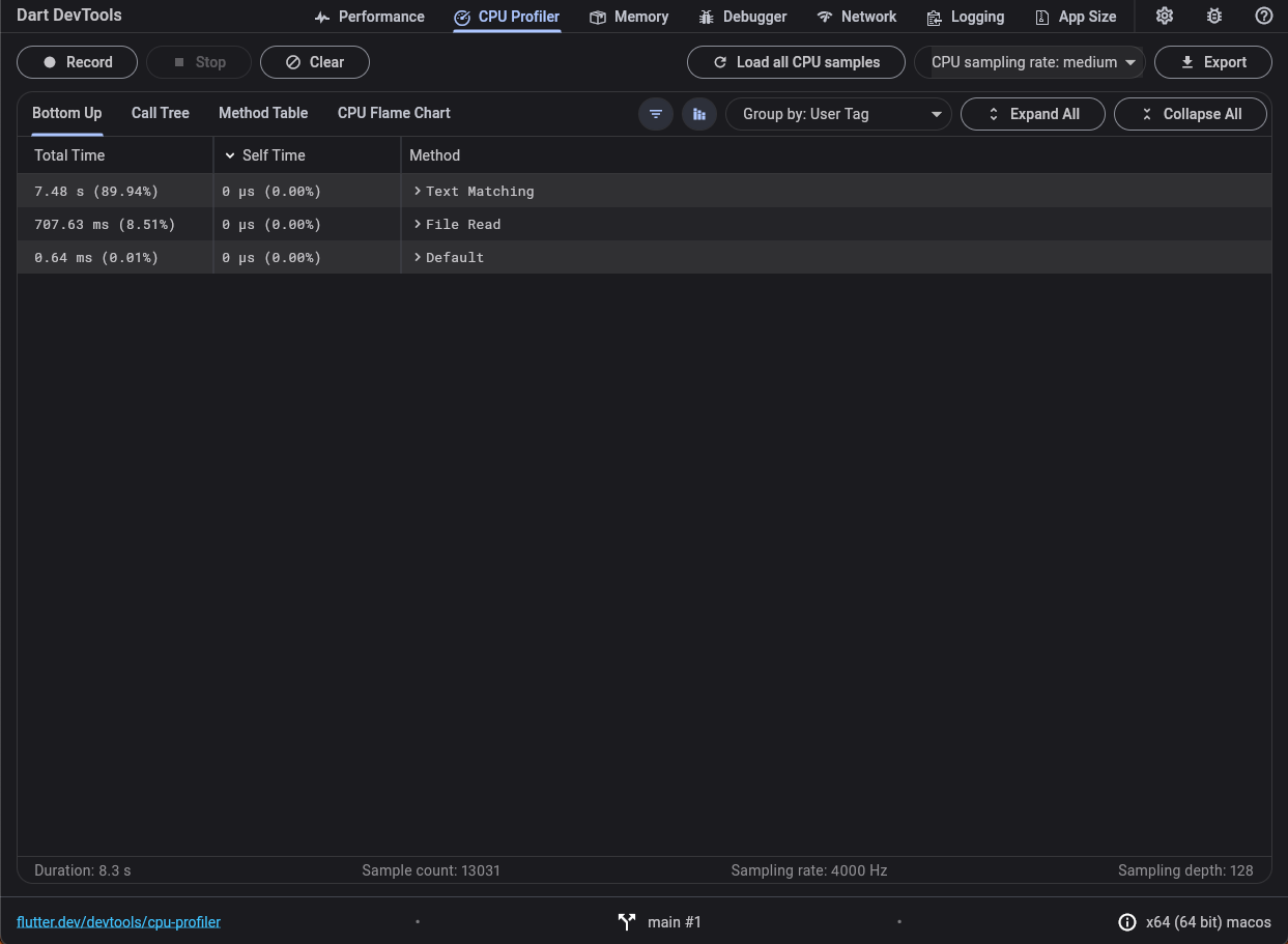 grep implementation. Let’s run the code again with --observe and open up the Dart DevTools CPU Profiler tab: