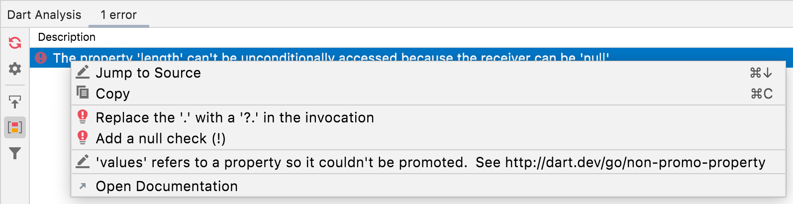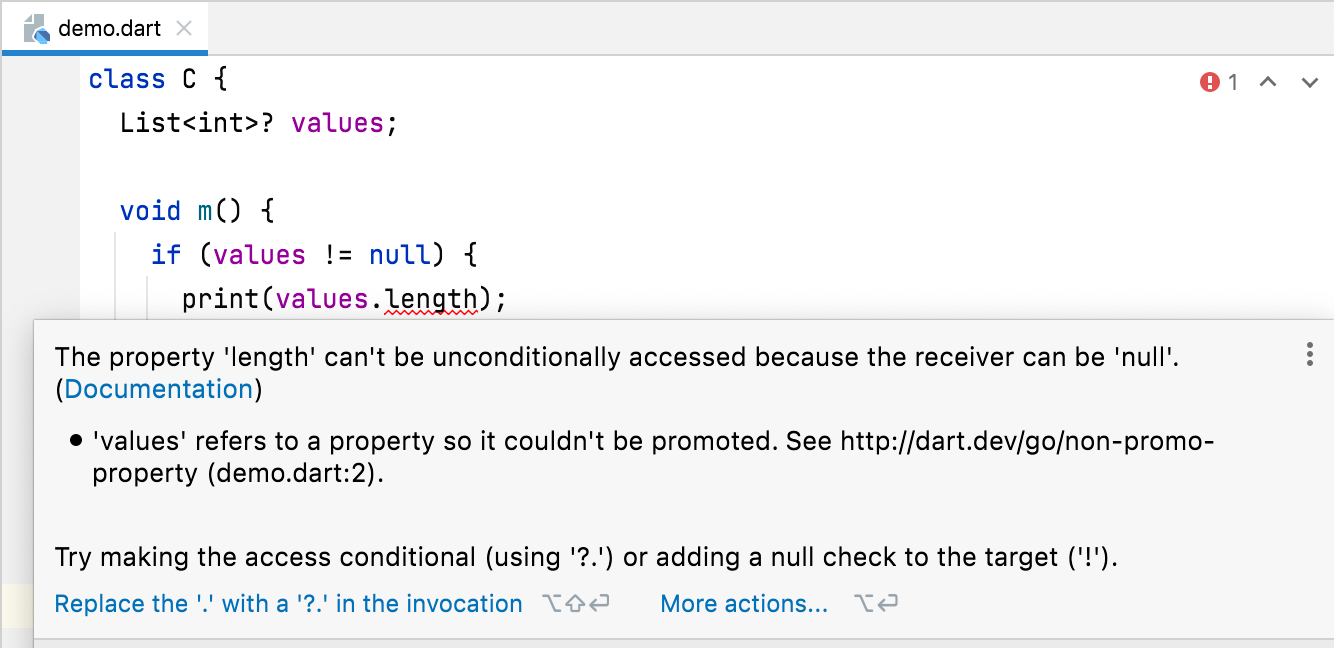 The context message includes the URL of additional documentation related to type promotion and tells you the line and file on which the field is defined. Unfortunately you can’t navigate to the context location from the hover, but you can from the Dart Analysis view.