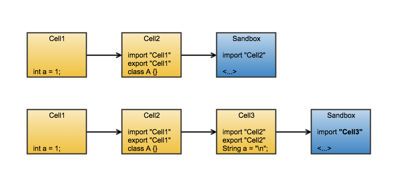 The diagram above shows how it works: as we add new top-level declarations, new “cells” (Dart libraries) are created which import (and export) the previous cell. The final cell is imported in the sandbox library that is used as execution environment for normal Dart expressions and statements. The sandbox file is edited in-place and then reloaded using hot reload.